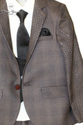 The suit features a distinctive charcoal-brown base with a subtle windowpane check pattern and a specialized textured finish on the lapels for a touch of luxury.