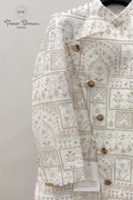 The Sherwani Jacket: Crafted from a premium suiting and embroided fabric with two subtle ice blue and off-white undertones, the jacket features intricate tonal embroidery.