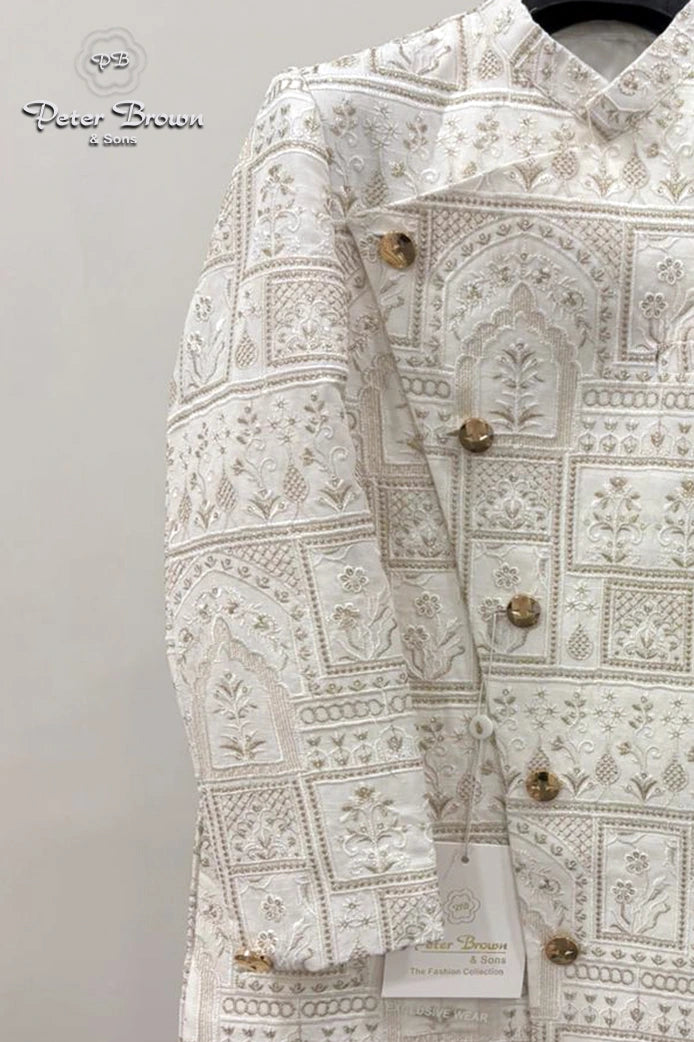 👑 This elegant Ice Blue and Off-White Sherwani Suit by Peter Brown and Sons is a masterclass in traditional craftsmanship tailored for the modern young gentleman.