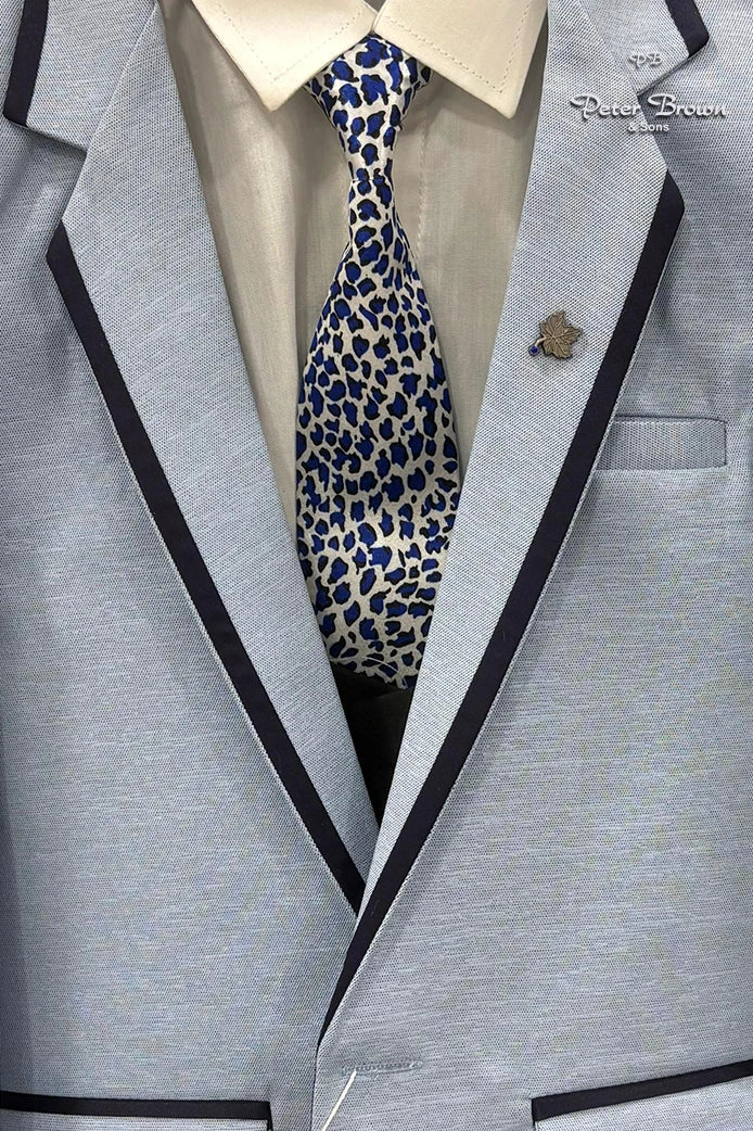 Statement Necktie: A bold, contrasting tie featuring a unique blue and white animal-print pattern that adds a playful yet high-fashion touch to the ensemble.