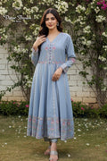 Color Palette: The soft, calming Azure Blue fabric provides the perfect canvas for the detailed pink and green floral embroidery, creating a fresh and vibrant look.