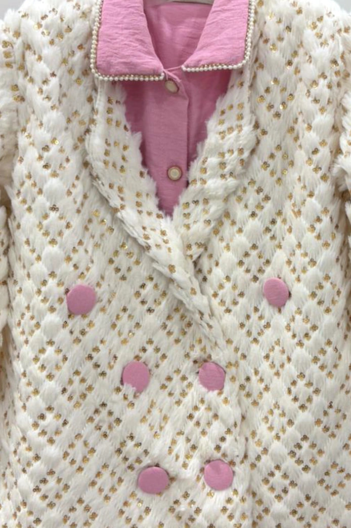 Buttons & Hardware: The coat is adorned with six oversized, rose-pink buttons in a double-breasted arrangement. These buttons act as a focal point, echoing the color of the inner suit.